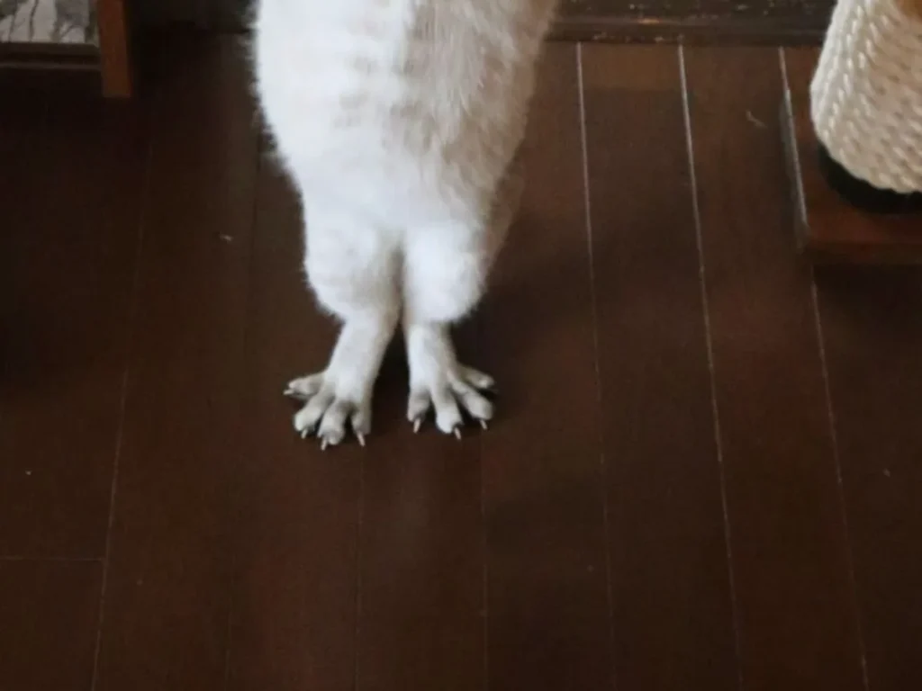 くうくんは一緒に暮らす猫の中でも、指の可動域が広いため、踏ん張って立つ脚が、たまたまフクロウのようになってしまったようです。
