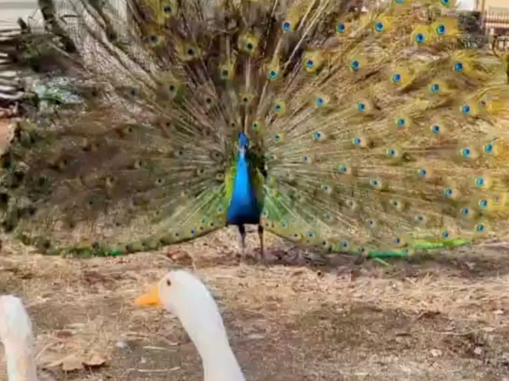 クジャクに焦る3羽のアヒルが『右往左往』!